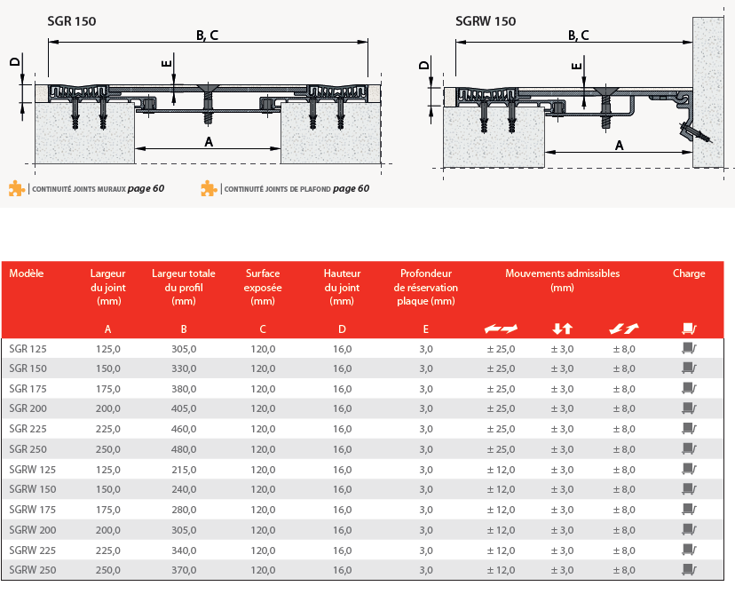 Profilés couvre-joints pour joints de 125 à 250 mm.