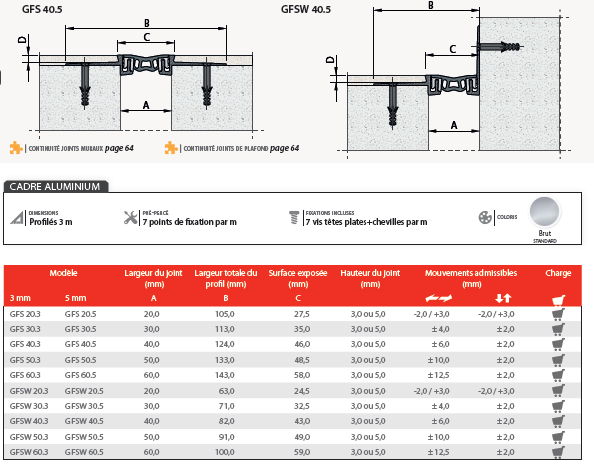 La série GFS est spécialement conçue pour les mouvements horizontaux et verticaux des sols en vinyle et des moquettes (5 mm). L’insert extrudé résiste au frottement et peut être remplacé.