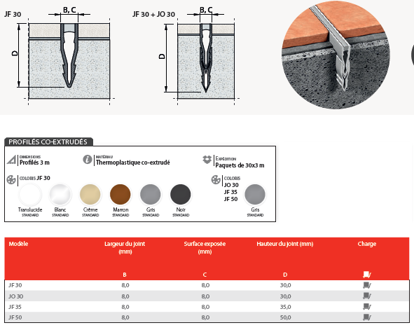 Profilé facile à installer conçu pour absorber les mouvements thermiques. Pour les joints plus profonds, le profilé JF 30 peut être combiné avec le JO 30.
