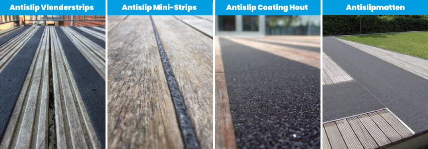 Er zijn binnen Storax verschillende soorten producten beschikbaar die vlonderplanken antislip maken. Antislip vlonderstrips zijn strips die door middel van verlijming of boren op vlonderplanken kunnen worden bevestigd om gladde vlonders stroef te maken. Antislip mini-strips zijn vergelijkbaar met vlonderstrips, maar dan kleiner van formaat. Deze antislip profielen gemaakt uit polyester versterkt met fiberglasvezels, zijn ideaal voor plaatsen waar extra grip nodig is, zoals bijvoorbeeld op een trap, brug of galerij.